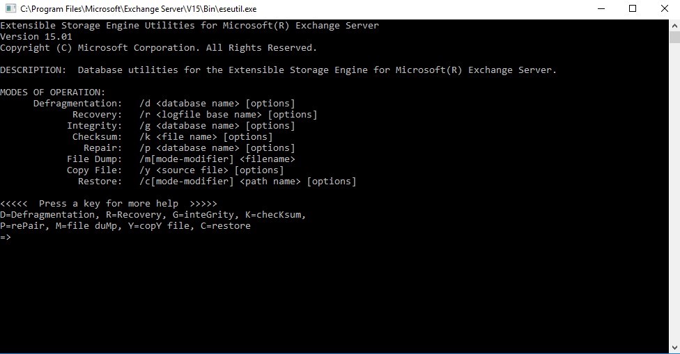 ESEUTIL steht r Exchange Server数据库实用程序。1 .参考文献1 .参考文献1 .参考文献1 .参考文献1 .参考文献1 .参考文献1 .参考文献1 .参考文献1 .参考文献1 .参考文献1 .参考文献1 .参考文献1 .参考文献1 .参考文献1。Um ESEUTIL auszuf hren, gehen Sie zu C:\Program Files\Microsoft\Exchange Server\V15\Bin and doppelklicken Sie auf ESEUTIL。