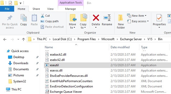 ESEUTIL代表Exchange服务器数据库实用程序。我们的应用程序exécutable我们的追求者和répare信息交换的错误,公共档案données运输服务器的注意文件。倒exécuter ESEUTIL, accédez à C:\Program Files\Microsoft\Exchange Server\V15\Bin et双cliquez sur ESEUTIL。