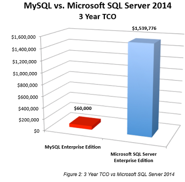 此外,MySQL授权版- MySQL企业版的总拥有成本(TCO)比MS SQL Server企业版要低得多。