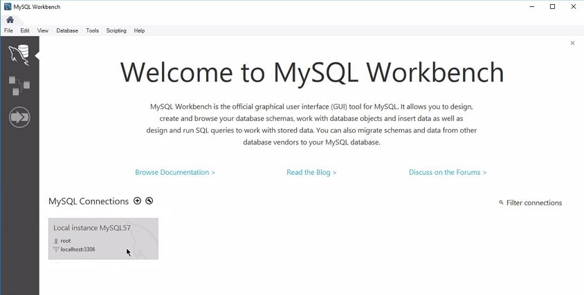 - 安装MySQL Workbench并在Workbench和目标MySQL服务器之间建立了连接之后,单击本地实例MySQL57(如下面的截图所示):