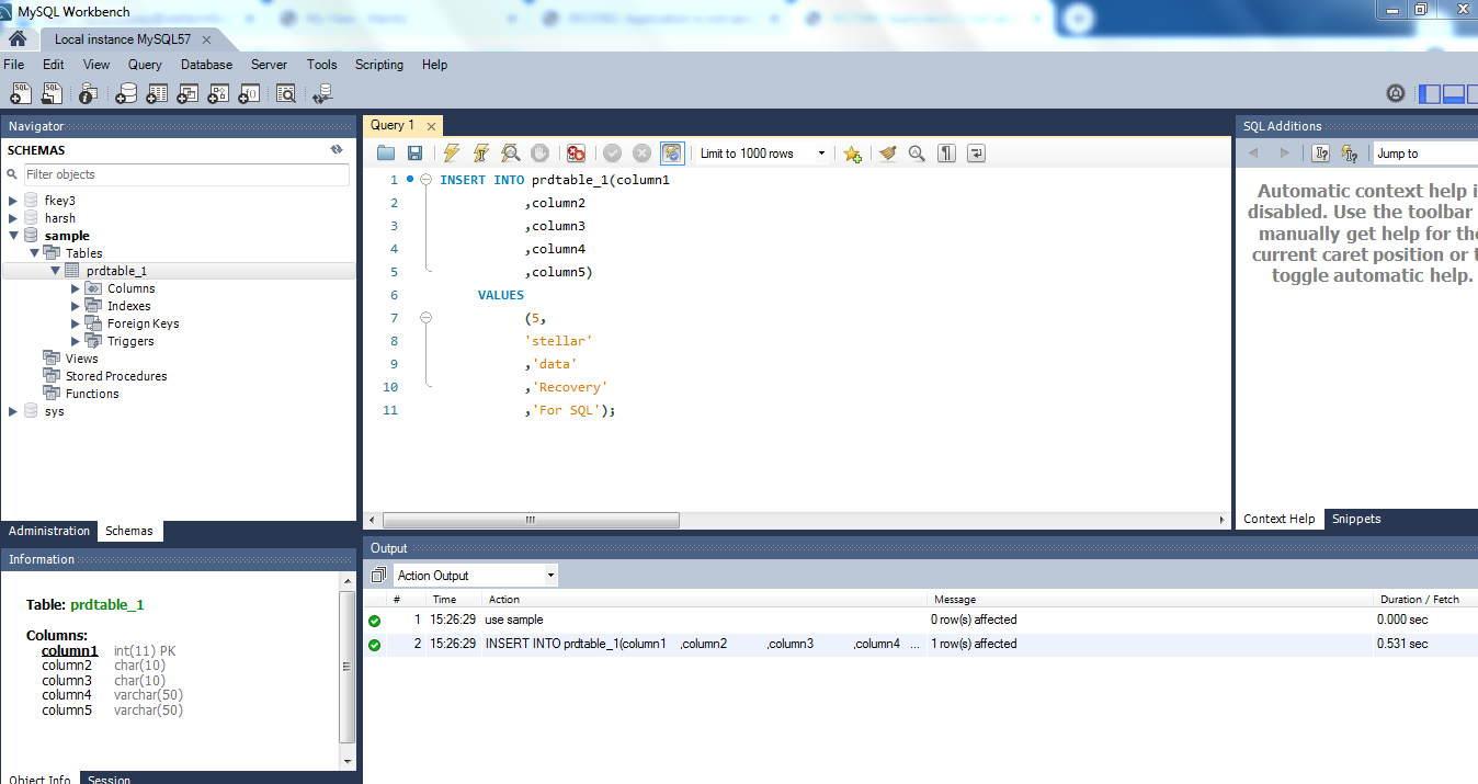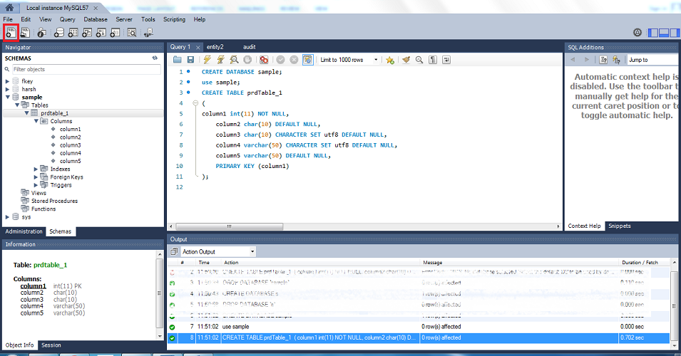 - 在本地实例MySQL57窗口中,单击SQL并输入以下代码片段: