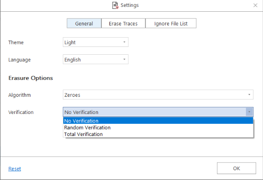 BitRaser文件橡皮擦使您能够从提供的18种算法列表中选择擦除算法。此外,还有三个验证选项可用于确保永久擦除数据。