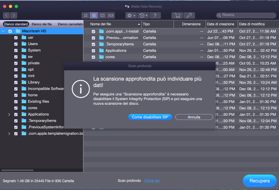10. Se hai eseguito una scansione rapida dalla schermataRecupera dae i dati che desideravi non sono stati recuperati, allora clicca sul linkClicca quidalla finestra di anteprima per eseguire una scansione approfondita. Viene visualizzata la finestra di dialogoScansione approfondita, che richiede di disabilitarela protezione dell’integrità del sistema (SIP)e quindi di eseguire una scansione profonda.