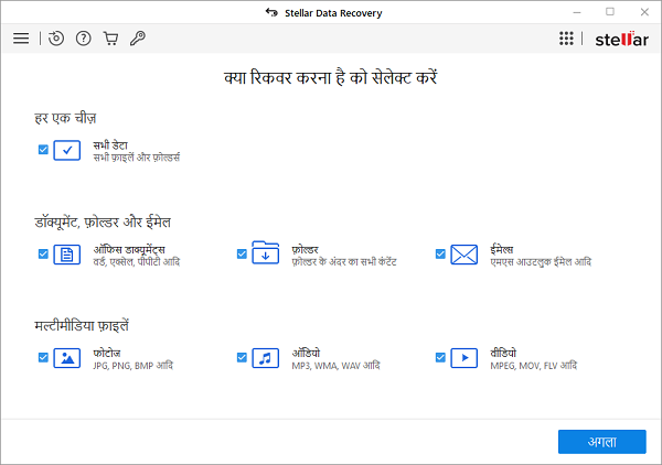 2.सलेक्टव्हाटटूरिकवरस्क्रीनसे, डेटाकेटाइपकोसलेक्टकरेंयानीसबकुछ,डॉक्युमेंट,फ़ोल्डरऔरईमेलयामल्टीमीडियाफ़ाइलें, जिन्हेंआपरिकवरकरनाचाहतेहैं।