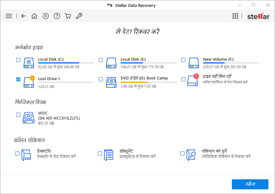 नोट:जब एक हार्ड डिस्क पर कई अनअलोकेटेड स्पेस होते हैं, तो यह कनेक्टेड ड्राइव के तहतलॉस्ट ड्राइव 1,लॉस्ट ड्राइव 2और इसी तरह दिखाई देगा। आप रिकवरी के लिए एक बार में केवल एक खोई हुई ड्राइव को सलेक्ट कर सकते हैं।