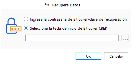 Atencion:Si analiza un disco duro encryptado con磁盘加密, sele solicitará que introduzca la contraseña o la clave de recuperación de Bitlocker, o bien sele pedirá que seleccione la tecla de inicio de Bitlocker (archivo . bek)。Para iniciar el análisis, using una de las sigientes opciones: